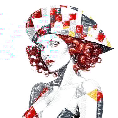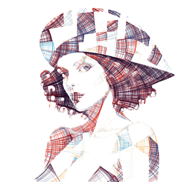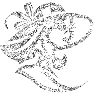 For the first stage, Studio Artist's Sketch-Crowquill preset was used to create the output shown left. When compared to the original Stable Diffusion start image, it can be seen that the portrait and hat borders are maintained and crow quill ink lines of various lengths and thicknesses are used for the dark regions of the original, while the lighter white areas are unaffected and remain the same. Click on the thumbnail image to see a larger size version, where the fine lines produced by the preset can be seen more easily.