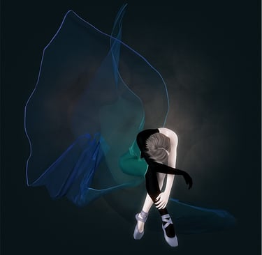 The following image also has a dance related theme, and features a ballet dancer in a posed position and wearing a translucent fabric cloth that billows around and above her body. The dancer takes up a relatively small area of the image, with more space devoted to the billowing translucent cloth. The colour scheme is subdued with a little bit of blue and green included, while the background lighting is relatively flat with a hint of brightness around the dancer's upper body.
