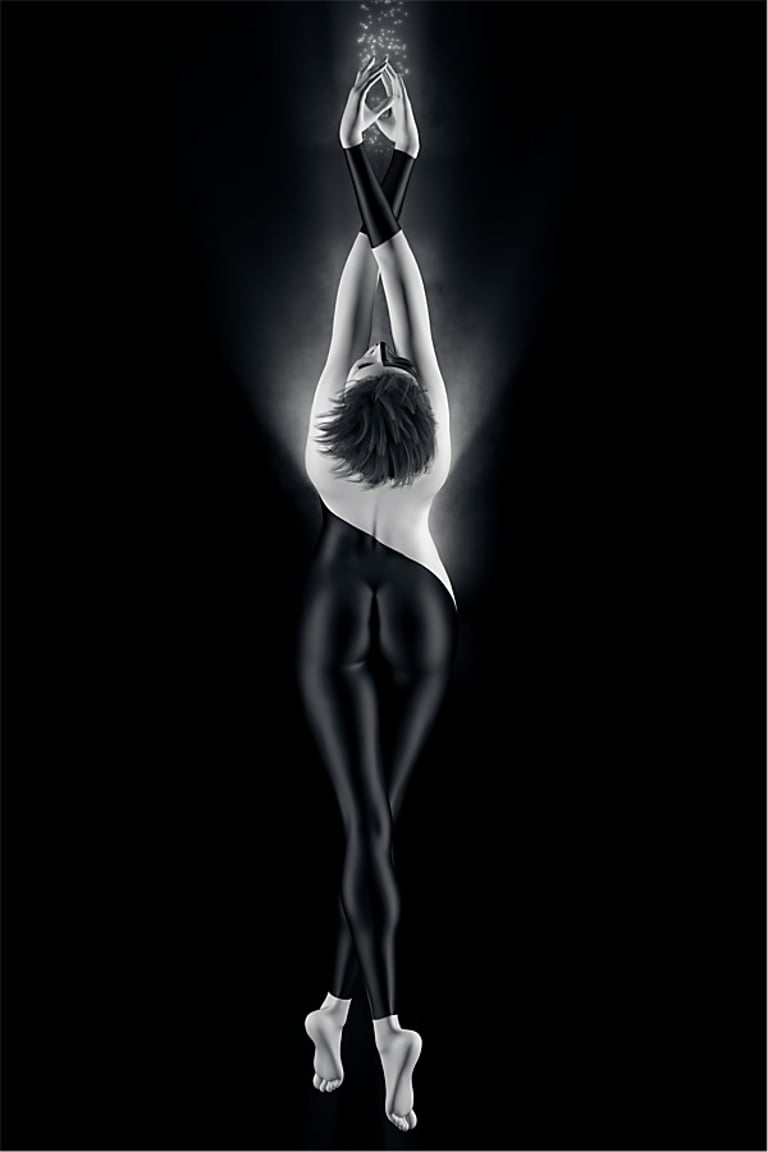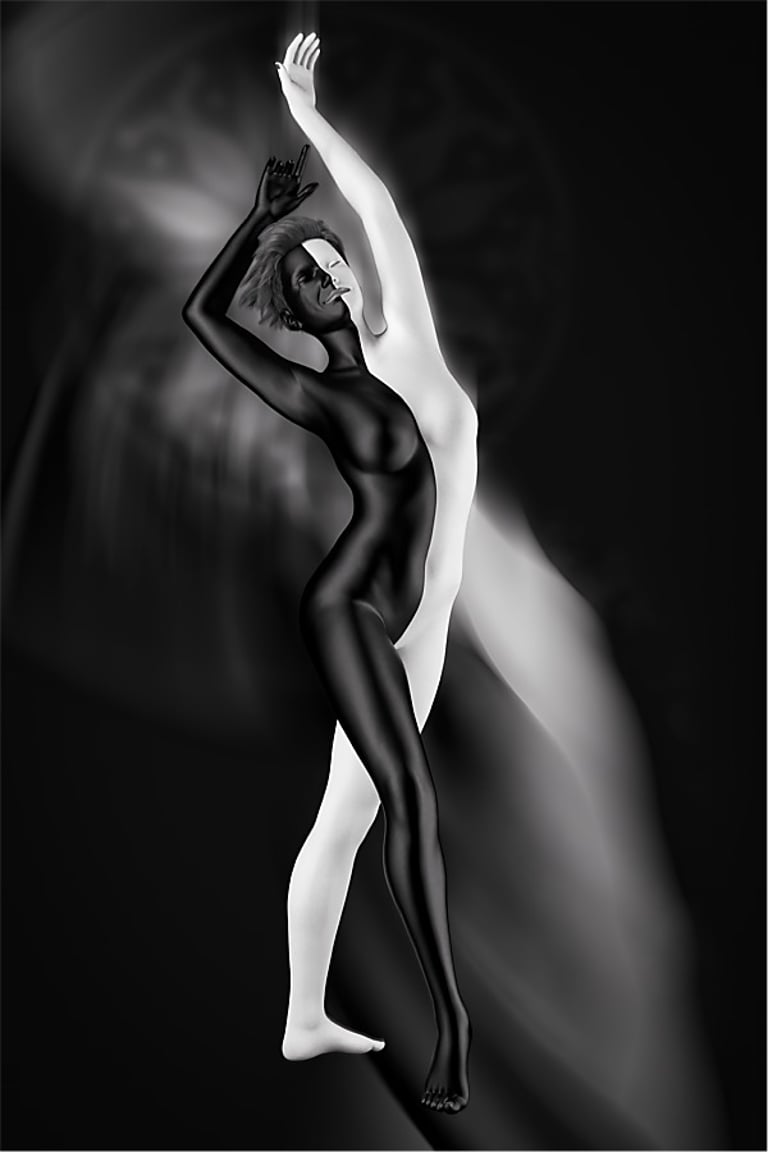 For the two example images below, the theme is female dancers in posed positions that could be part of a dance routine. In both cases, the colour scheme is monochrome, and the characters bodies have distinct black-white elements that fit well with a monochrome presentation. Lighting is high contrast, and outline highlights help define the shape and position of body elements coloured black that otherwise might blend in too much with the dark coloured background.
