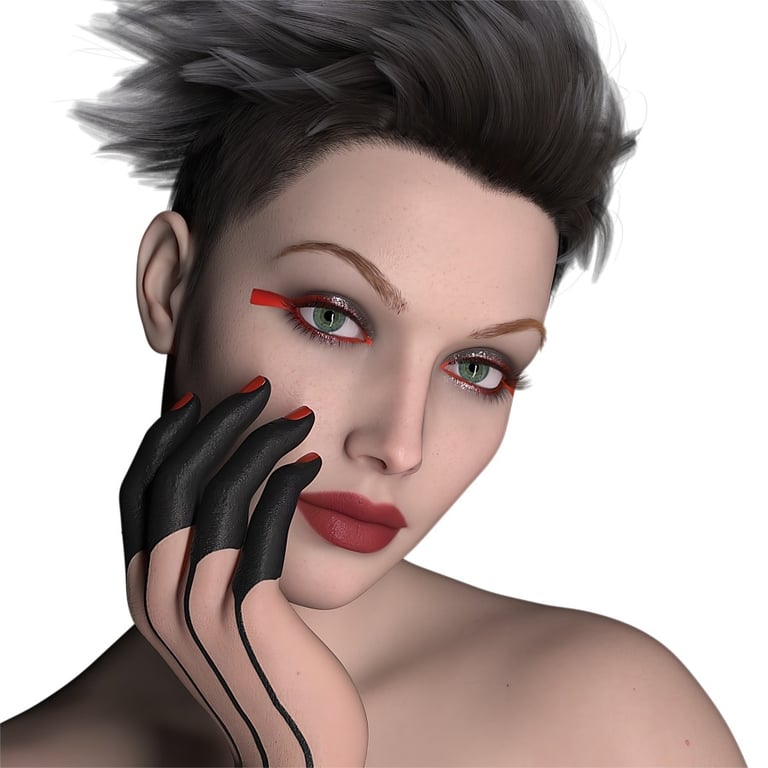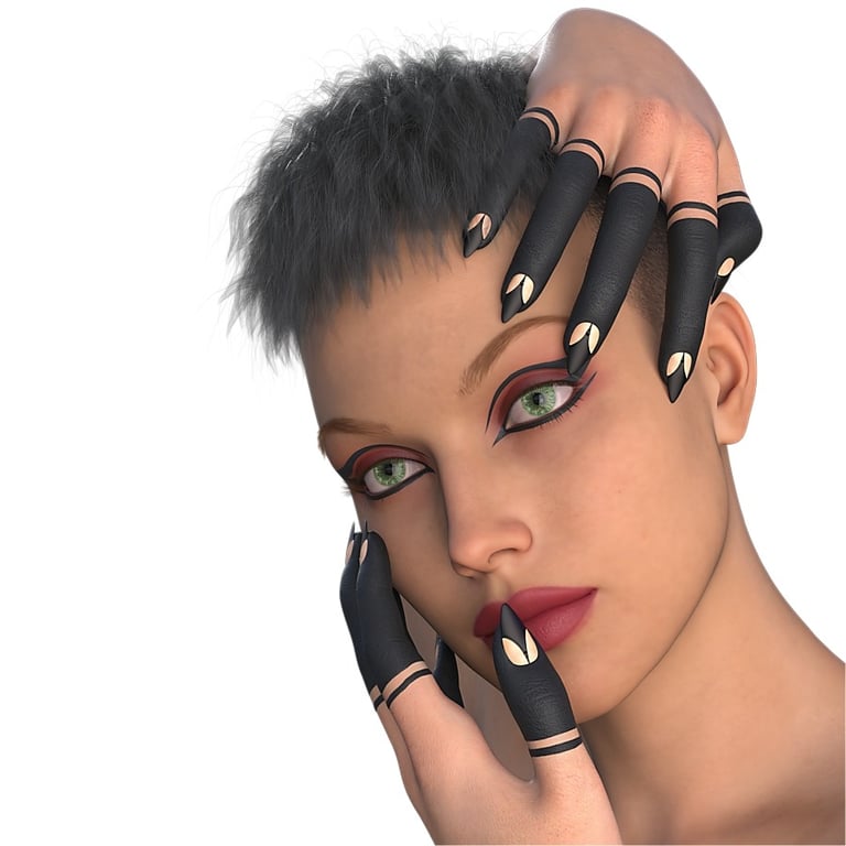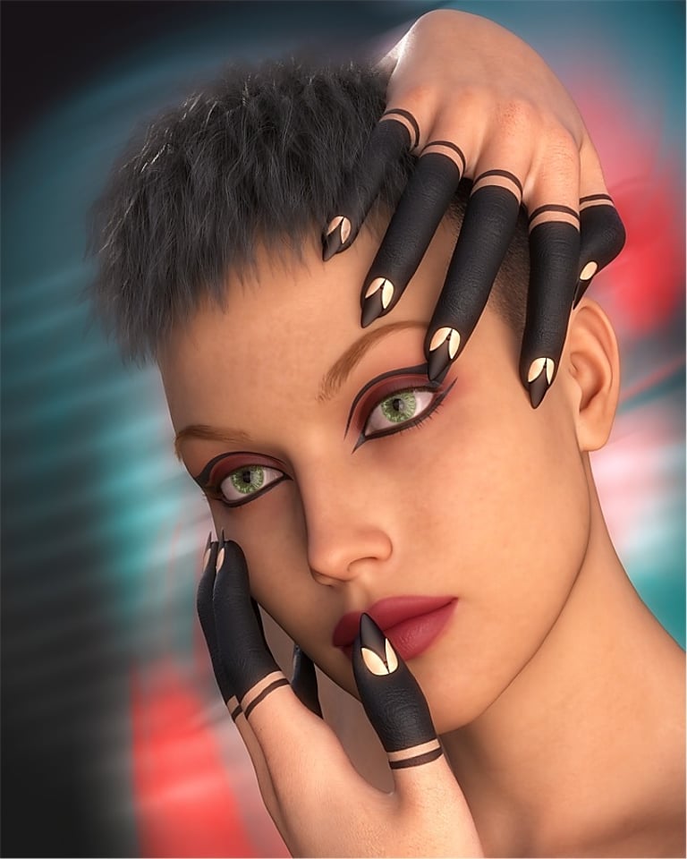 A further example of the same female character with a different pose is shown below. Lighting is from a single source on the right hand side, with a dark background on the left hand side that could be ideal for an advertising style image where white text might be added on the left side to give information about the henna style fingers, or the shape and style of nail art used in the image.