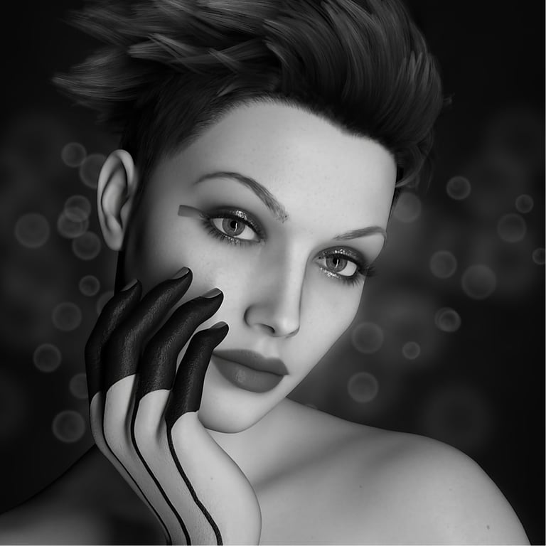 The image shown left is the original output render from Daz Studio, with a white transparent background, while the image shown right is the same image after further editing with an image editor. The edited version is intended to look like a sophisticated classic monochrome portrait, with some subtle background bokeh effects added for visual interest.