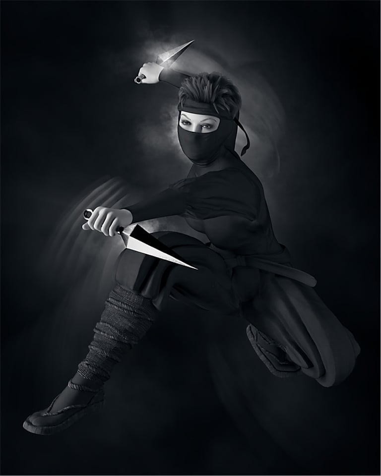 Finally, some subtle background lighting and motion blur effects have been added to both images to help convey a sense of the characters being in motion, literally, a ninja's deadly dancing in the shadows.