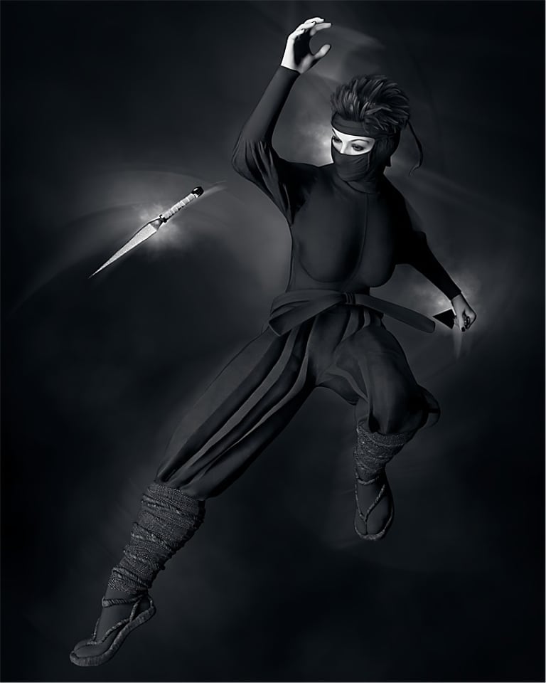 Fantasy characters are very popular within digital and 3D art, including things like elves, animals, monsters, robots and more, all of which are possible with Daz Studio. In the examples below, I produced two images of Ninja style females (known in Japanese as Kunoichi) with appropriate clothing and weapons. Given the shadowy nature of these type of characters, my intention was to portray them dressed in dark clothing against a dark grey background with some subtle lighting and blur effects.