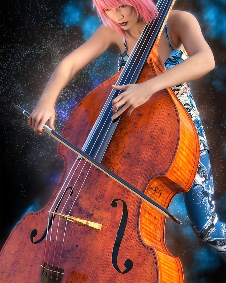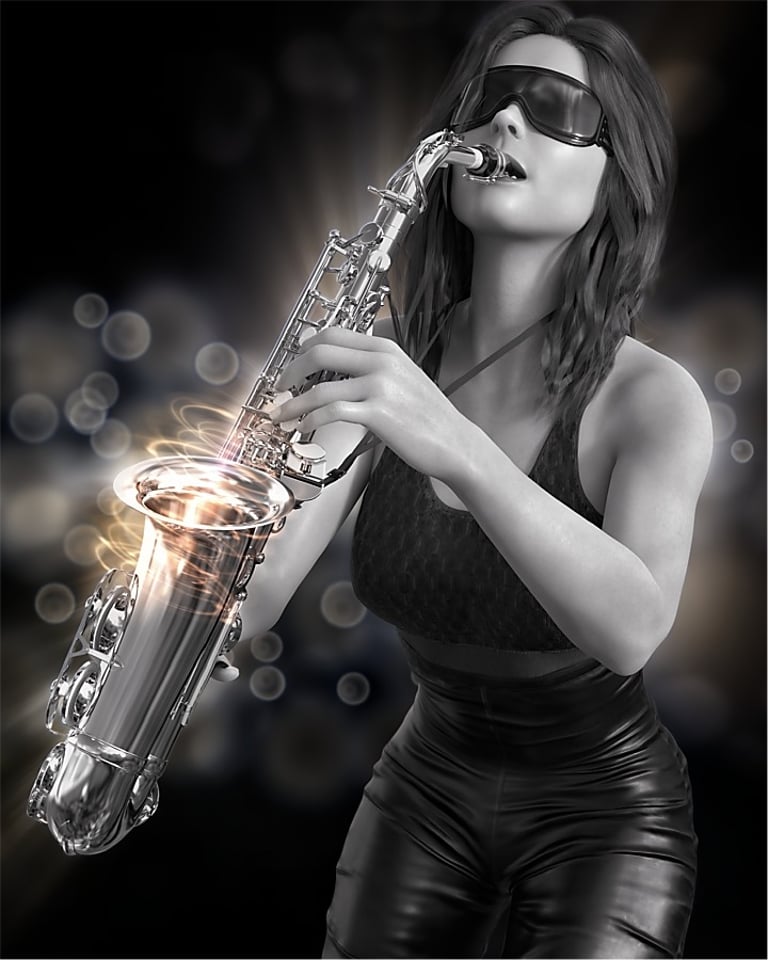 If female ninja warriors are not your thing, then no problem, as multiple other options are available. The two examples below are music related with a saxophone and cello being played by a young female musician. The original Daz Studio rendered files had empty transparent backgrounds, giving me the opportunity to add something visually interesting to the final version of the image.